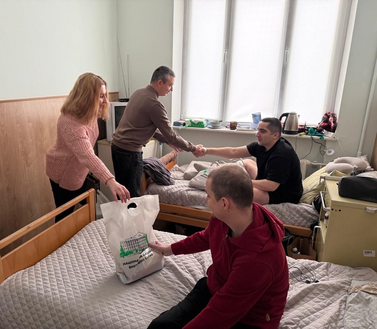 31-12-2025 Переглядів: 43Напередодні Нового року працівники інституту заочного та дистанційного навчання Національної академії внутрішніх справ разом із працівниками відділу соціального захисту і супроводу постраждалих і членів їх сімей відвідали поранених військовослужбовців, які проходять реабілітацію після тяжких поранень у ДУ «ТМО МВС України по місту Києву та Київській обл.».